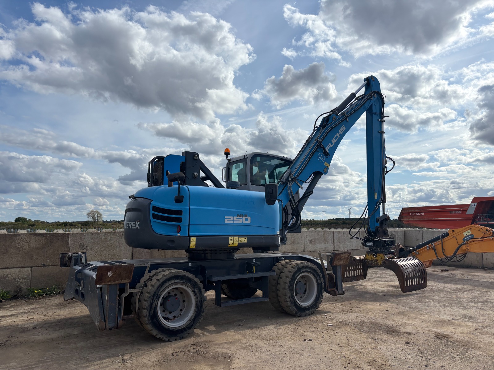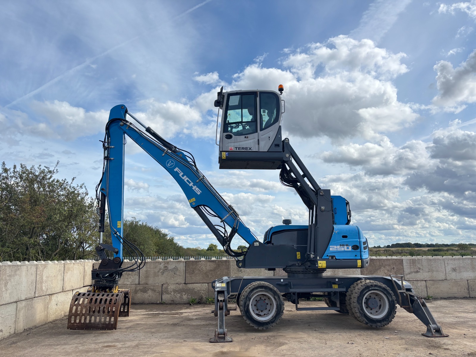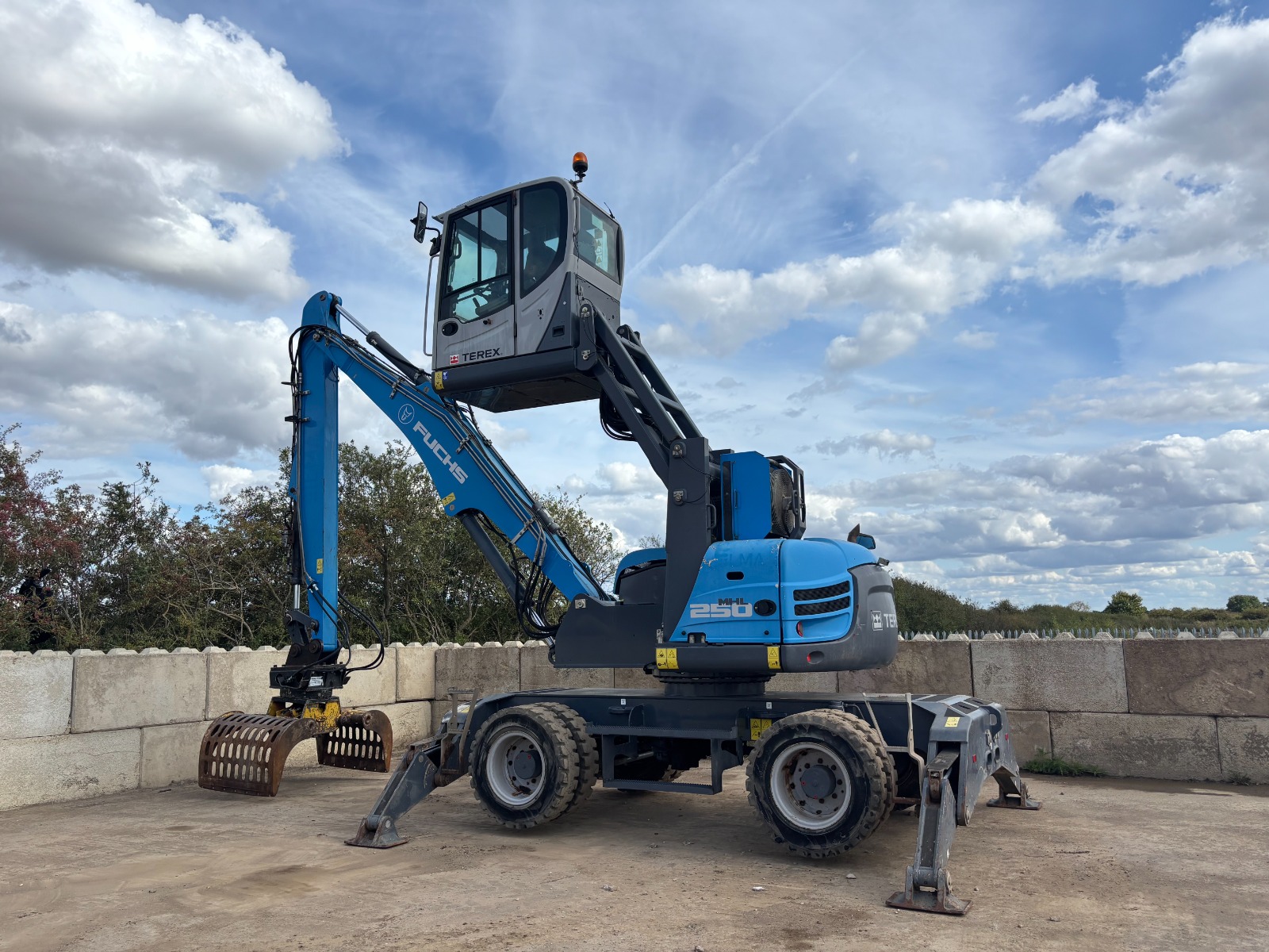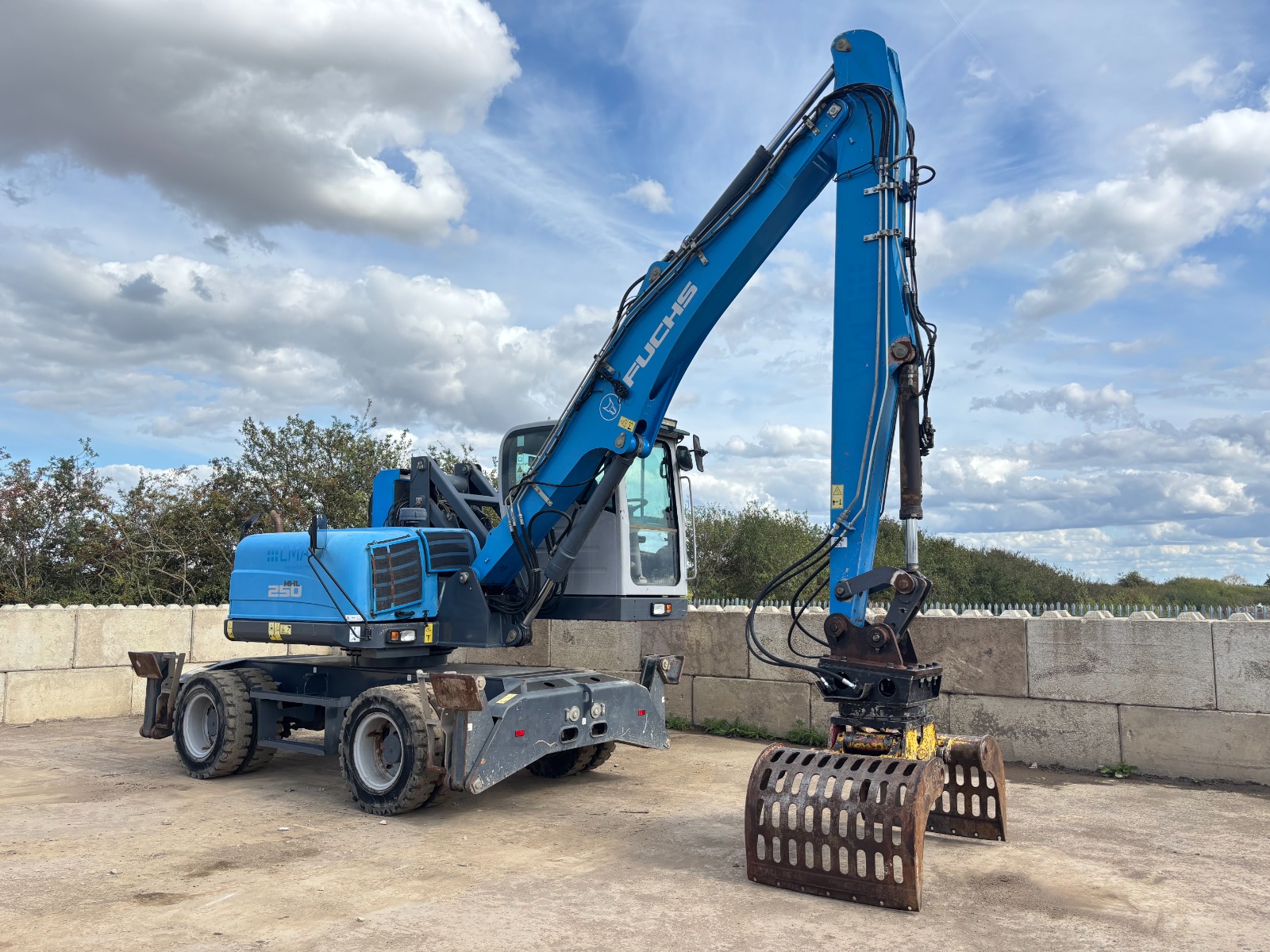 Maszyna przeładunkowa z podwoziem kołowym i podnoszoną hydraulicznie kabiną. Idealnie nadaje się do wysokiego załadunku/rozładunku. Posiada podpory przednie oraz tylne, klimatyzację, silnik Deutz, centralne smarowanie, pełne opony, chwytak obrotowy. Maszyna w bardzo dobrym stanie – zarówno technicznym jak i wizualnym.